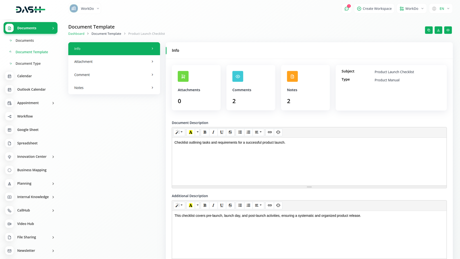 Revolutionize your document management process with Dash SaaS's Document Template Integration, designed to simplify template creation and customization. Craft personalized document templates effortlessly to suit your organization's unique needs. With intuitive controls and a user-friendly interface, defining document structures, details, tags, and parameters is a breeze, ensuring each template aligns perfectly with your workflows.
