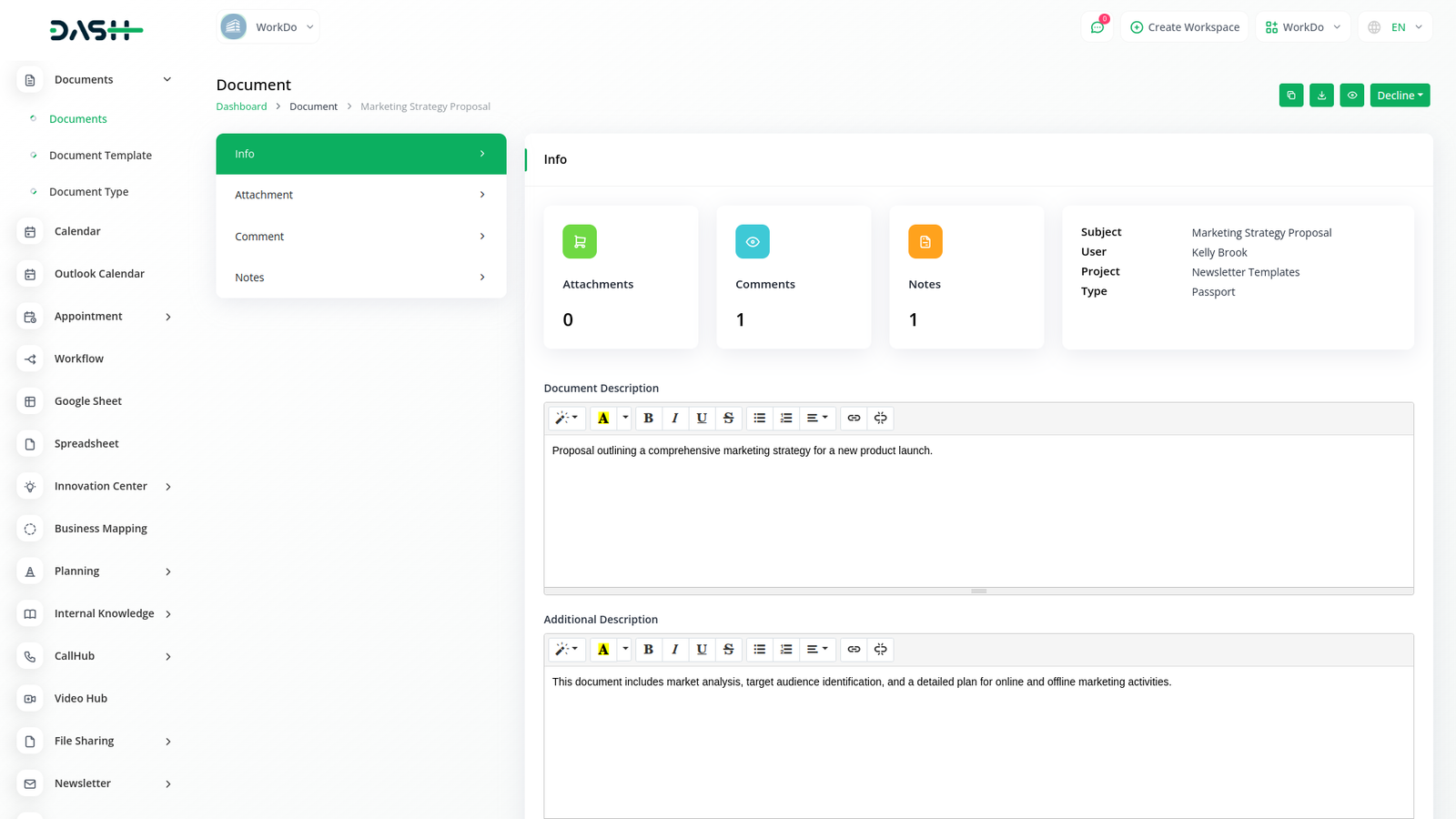 Effortlessly organize and access documents in one place with Dash SaaS's Documents Integration, allowing easy attachment, commenting, and note-taking for enhanced collaboration